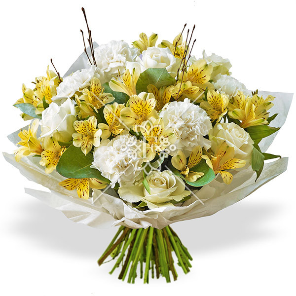 Великолепное сочетание желтой альстромерии, белоснежных гвоздик и ванильно-белых роз, украшенных декоративной зеленью, привлекает и очаровывает с первого взгляда!